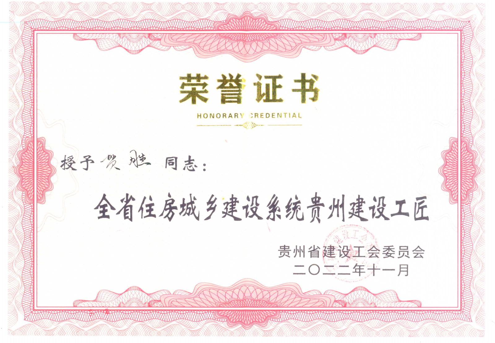 賀勝同志獲得 “建筑信息模型技能大賽”全省第一名,并被授予“全省住房城鄉(xiāng)建設(shè)系統(tǒng)貴州建設(shè)工匠”榮譽稱號,同時獲得5000元現(xiàn)金獎勵。